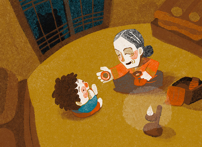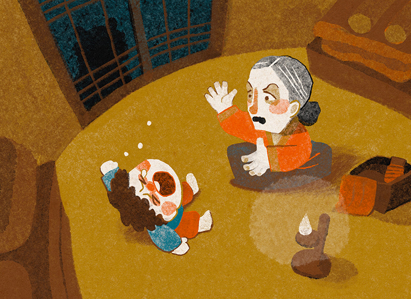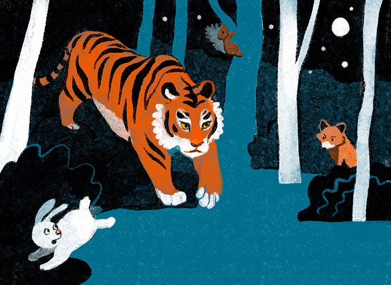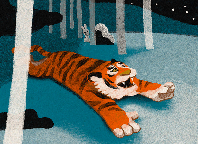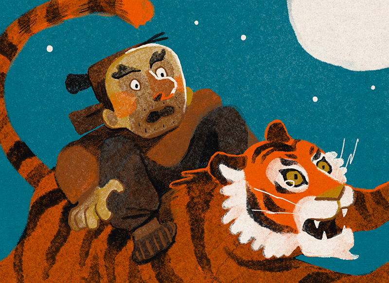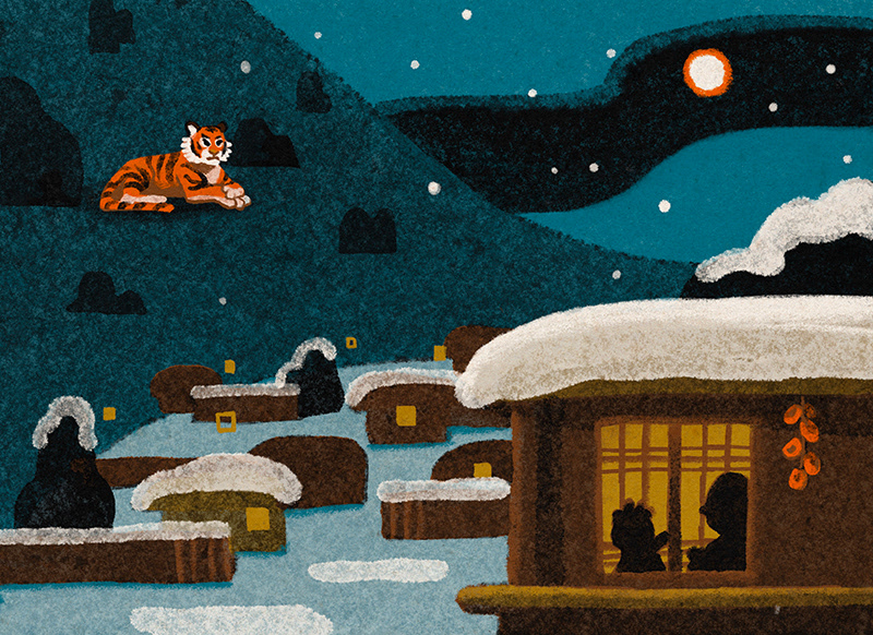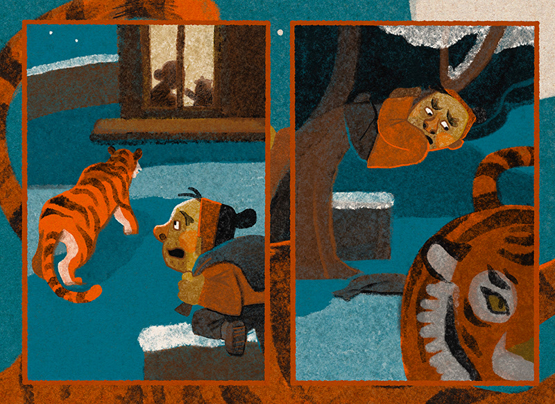 It was one cold winter day. A big and scary tiger was looking for something to eat. So he decided to go down to the village. At the first house he found, the tiger heard a boy crying...